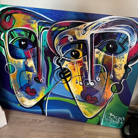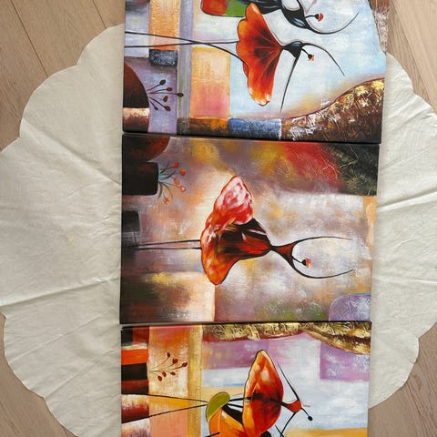 Store og fine malerier selges. Den første og andre på bildet for 1900kr per maleriet, den tredje for 1500kr.