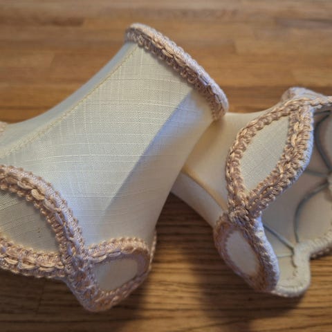 Lampeskjermer selges for 250 kroner (høyde 13,5 cm / diameter 12,5 cm). Fraktkostnader: PostNord - 69 kroner. Betaling via vipps.
