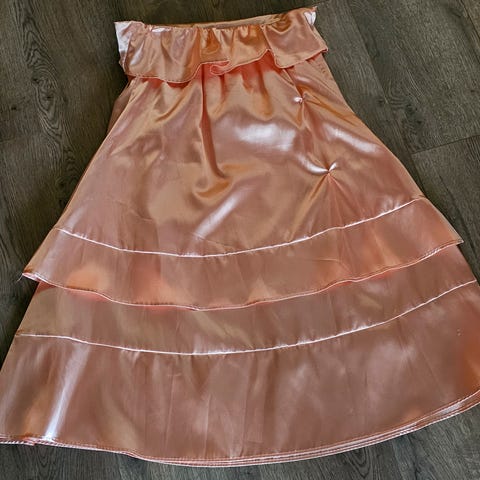 Nydelig fasongsydde kjole i brokadestoff med ballongskjørt.