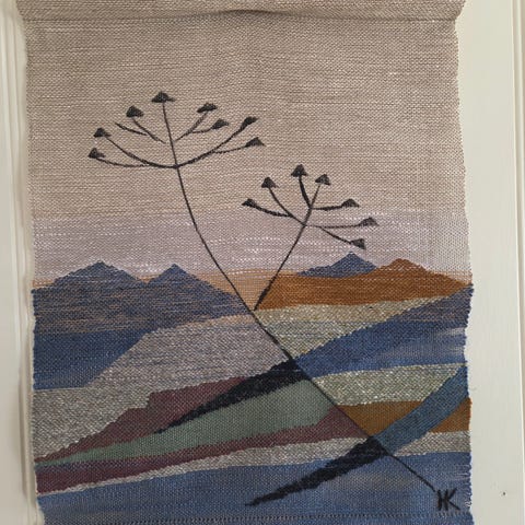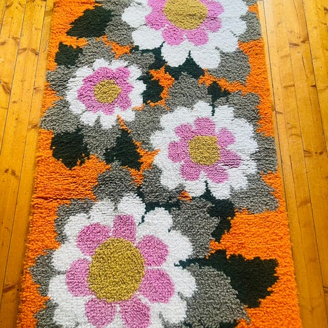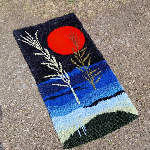 Vintage håndknyttet teppe fra 80 tallet med veggoppheng i tre. Flott motiv med sterke klare farger. Hel og pen, fremstår som ubrukt. Måler 85 x 65 cm. Kan hentes i Oslo eller sendes. Selges kr 450,-