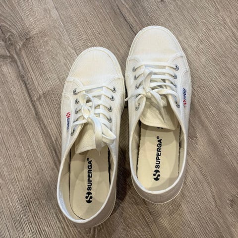 Beige superga, størrelse 38. Har noen flekker som mulig går av i vask. I god stand ellers.