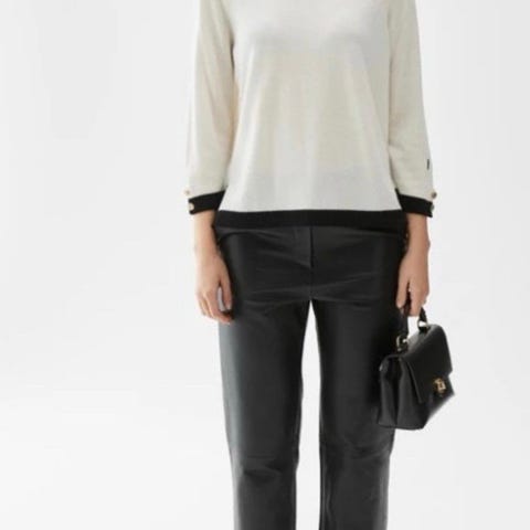 Lekker genser i merinoull med rund hals og gullknapper i ermene. Kontrastfarge i halsen ermene og nederst.