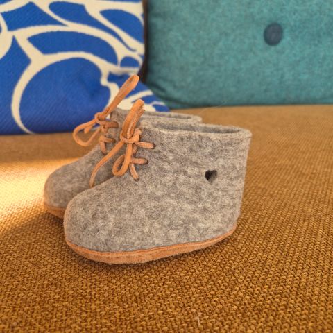 Søte ull tøfler fra «Tova» str 20. Pent brukt og sitter godt på. Fine å ha på i vognposen el å gå rundt med i sine første skritt 😊
