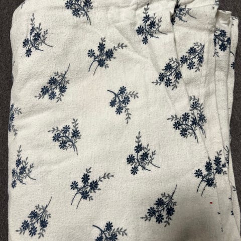 Har en stripe i stoffet ca 10 cm fra kanten. Kjøpt slik. Ses på bildet.