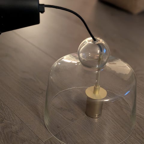 Pent brukt taklampe i beige, måler 42 cm i bredden.