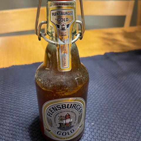 Kjøpt i Flensburg håndballarena i Tyskland, med bilde av lagets håndballspillere. Brukes som ølglass i hallen.