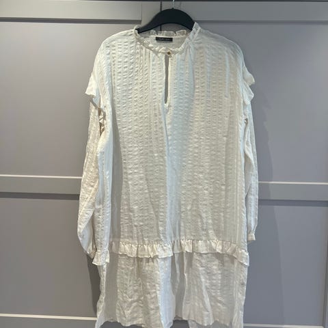 Pent brukt kjole/tunika fra BikBok, str M. Har klippet av merkelapp, men det er nok endel syntetisk i den. Armene har strikk, men som du ser på ene bildet har jeg brettet opp armene pga varmt ute. Ingen bruksmerker. Fargen er cream. God passform.