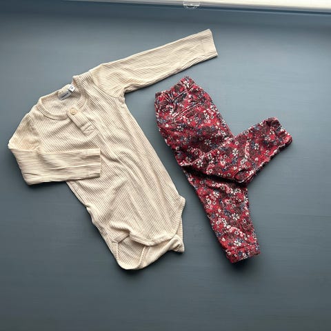 Sett med tights i myk denim og to tunikaer, alt fra Zara, str. 86, selges samlet. Den broderte tunikaen har knapping i ryggen for enkel av- og påkledning. Én av trådene på broderiet er litt løsnet, men kan enten sys fast eller klippes av