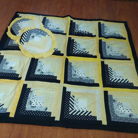 Et meget vakkert sengeteppe med mønstre: bredde 250 cm, lengde 240 cm, samt to putevar med mønster: bredde 60 cm, lengde 80 cm.