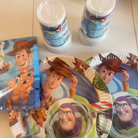 Helt nytt, ubrukt. Papptarelkener, kopper, 12 godteposer, veggpynt, 8 ballonger, servietter.
