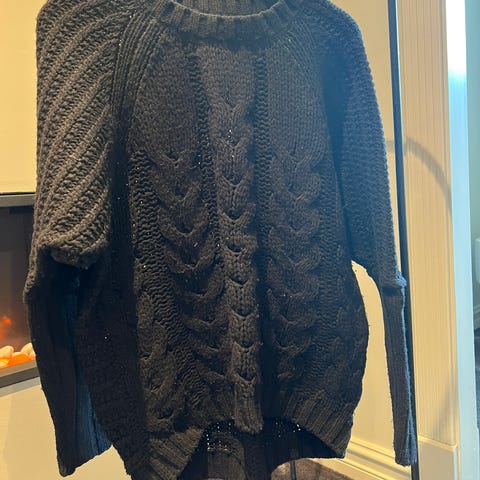 Flott mørkeblå genser fra Hunkydory. Knytedetaljer nederst på genseren oppbrett på armene. Brukt to ganger, så fremstår som ny
