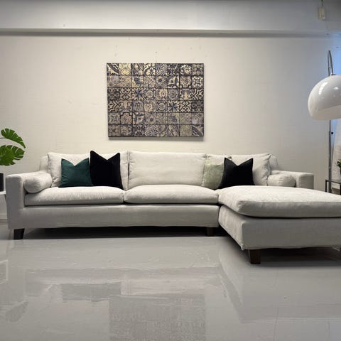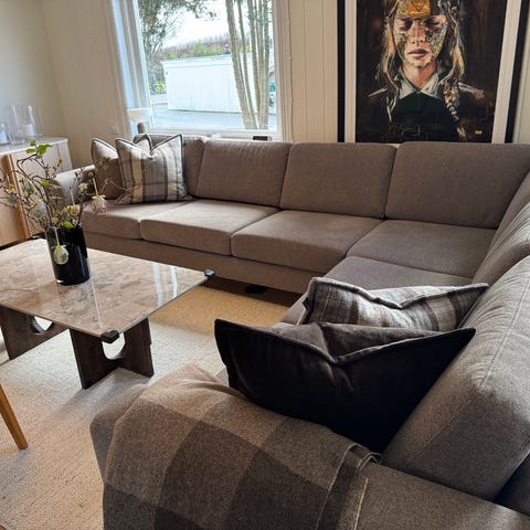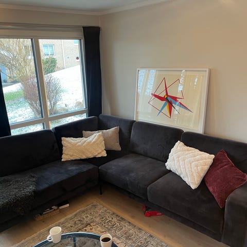Morris sofa er designet av Anika Reuterswärd og er en av Fogias mest populære sofaer. Med en ramme av massiv bøk og polstring av kaldskum, bomull og dun bidrar den til en utrolig behagelig sitteopplevelse som det er vanskelig å reise seg fra. Denne (Morris Corner) består av en 2-seter + hjørne + 2,5-seter og en sjeselong. Sofaen kommer fra et barne- og dyrefritt hjem og har ingen flekker eller bruksslitasjer. Trengs ingen rens eller vask.