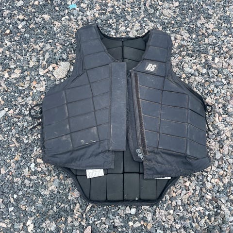 Minimalt brukt sikkerhetsvest fra jeg selv var liten og holdt på med hest. Kan ikke huske at den ble noe brukt, det ser i hvertfall ikke slik ut. Har ligget lagret i lufttett kasse siden.
