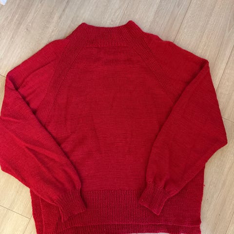 Selger en hjemmestrikket Kelly genser med splitt i str S. Den er strikket i Peer Gynt - pasjonsblomst og tynn silk mohair. Alle mål står i bildebeskrivelsen. Fargen kommer frem litt varierende på bildene, har lagt ved bilde av nøste der fargen viser.