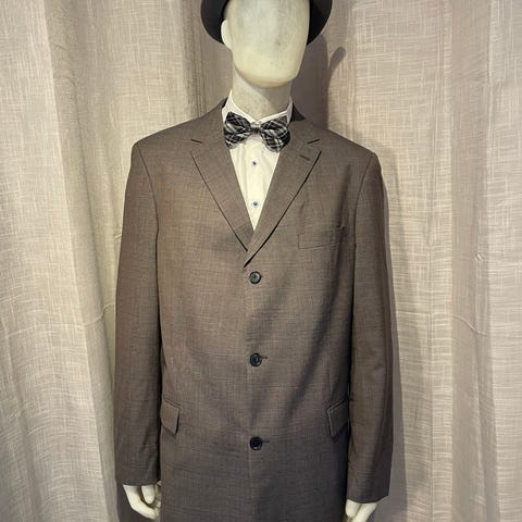 Herre bukser i grå farge i størrelse XL. Klassiske dress-/penbukser med beltehemper og baklommer med knapp. Passer til bruk i jobb, hverdag eller til mer formelle anledninger. Materialet fremstår som vevd stoff med glatt overflate. Flere like varianter i lignende gråtoner vises på bildene.