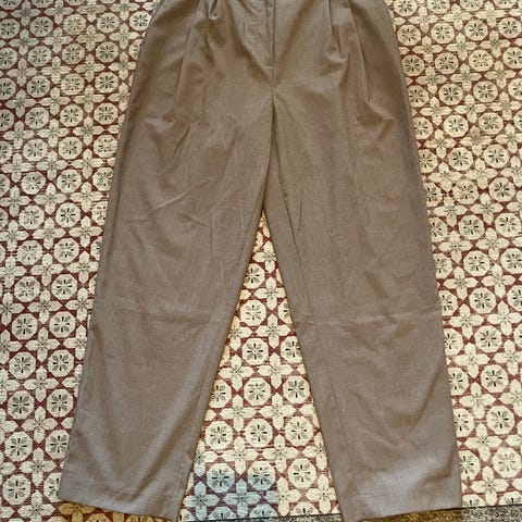 Bukse i fin gulfarge fra Reserved i størrelse 40. Livvidde er 80 cm, skrittlengde 24 cm og indre benlengde 66 cm (ankellengde). Lommer fremme, falske lommer bak. God stretch i stoffet utover oppgitte mål. Pent brukt uten flekker eller skader.