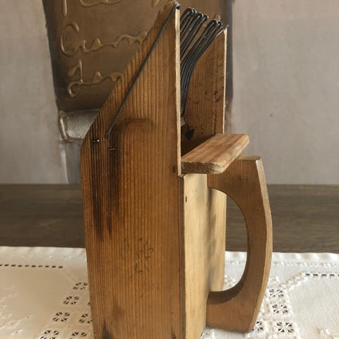 Bærsankeren er lagd av tre, spileverk i tykk ståltråd i bunn og front.
