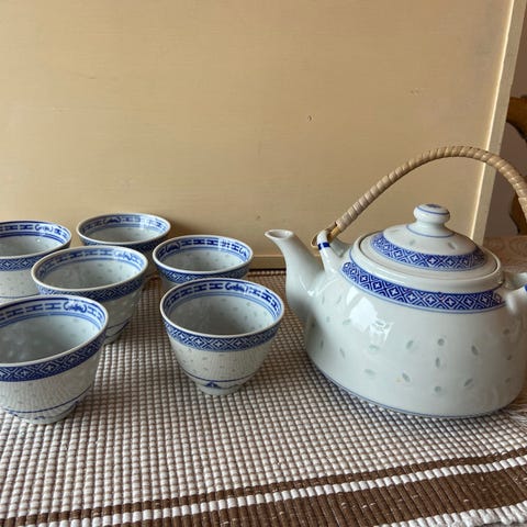 Stor fin vintage retro blå pg hvit kinesisk tekanne med riskorn mønster selges kr 450,-