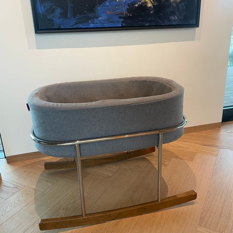 Blitt brukt til ett barn, fordelen er at den vugger riktig vei (ikke til siden så hodet slenges). Laken tilhørende vuggen følger med.
