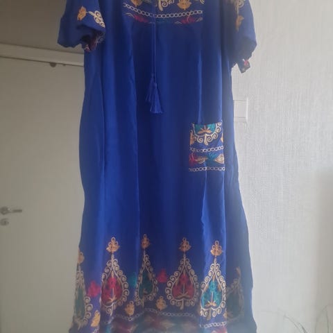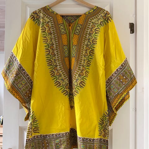 Helt ny og laget for hånd i Ghana, men litt for stor for meg ☹️ Solid stoff, tre kvart ermer og splitt i siden, veldig pent sydd. Kan passe ulike størrelser avhengig av hvor oversized du liker det!