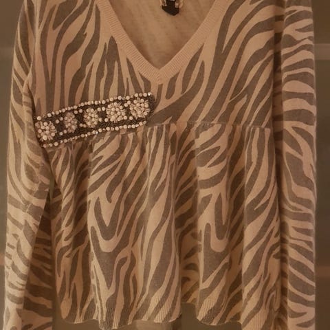 Lekker topp fra islandske Andersen & Lauth! Det er A-line/A-fasong så den har stor vidde nedover. Str 40, trekvart lang erm og detaljer som små ‘speil’ rundt bl.a halsåpnigen, ermekantene og nederst. Ytterst lite brukt og som ny! Nypris ca 1600,- selges 329,-