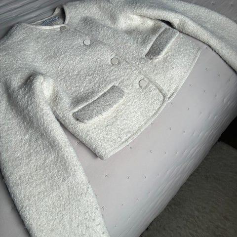 God jakke i størrelse 38 (ca.). Behagelig, mjukt og tøyeleg stoff; ei blanding av bomull, viskose, lin og syntetisk.