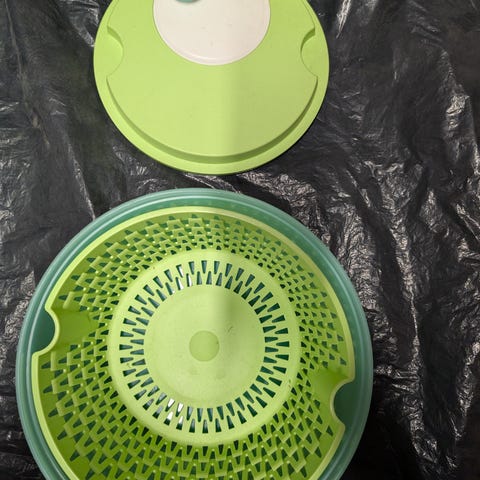 Ikke vært i bruk. Åpninger i bunn og lokket. Brukes til å skylle feks frukt og bær. Kan også brukes til en liten salatslynge,- riste ut vannet. Beholderen er på ca 1 liter