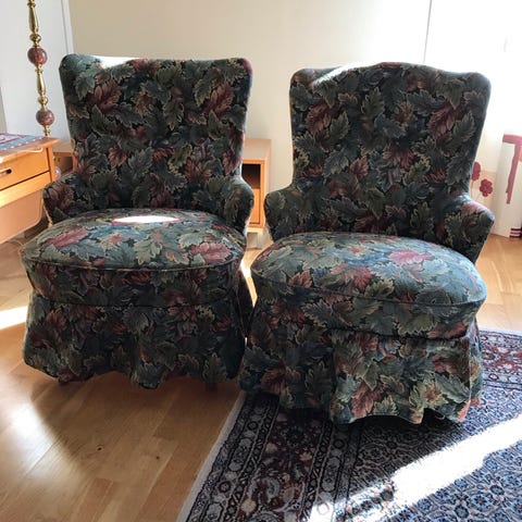 Tung og solid stol med hjul. Den er trukket om, antagelig tidlig på 90-tallet etter stoffet å dømme. Begynner å bli ganske slitt på armlenene, eller ser den ok ut.