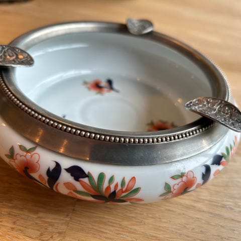 To porselens askebeger eller flaske-/glassbrikker med gull dekor, fra Porsgrund Porcelænsfabrik, diam. 10,5 cm, og et askebeger fra stjernekokk, Roger Lamazères restaurant i Paris, merket "Roger Lamazère - Le Rabassier", diam. 12 cm. Kr 25 pr stk for de norske, kr 75 for det franske. Kr 100 for alle tre. Må hentes innen 19.01! Har Vipps.