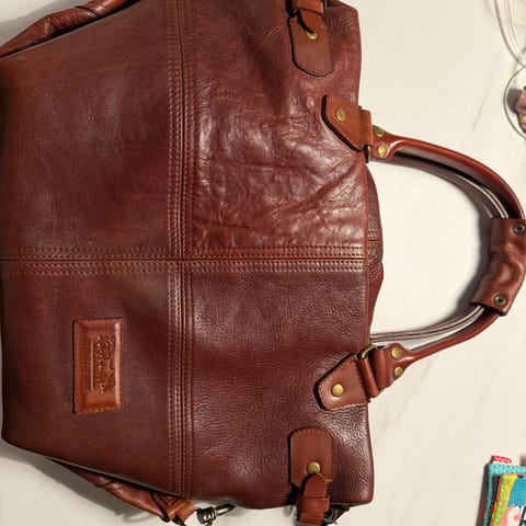 Dette er ekte håndarbeide. Alle delene er håndskjært av meg, håndsydd med Kengurusnor, farget med ECO FLO lær/skinn farge og tatt på ECO FLOW SATIN SHEEN som er en lær finish. Justerbar skulderrem, Håndpreget og ja rett og slett mange mange timers arbeide.