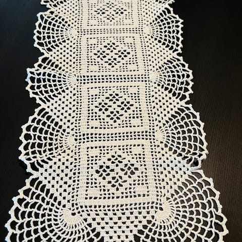En gul heklet løper- str 105x27 cm, en gul heklet brikke - str 40x40 cm og en litt mindre gul heklet brikke - str 10x10 cm.
