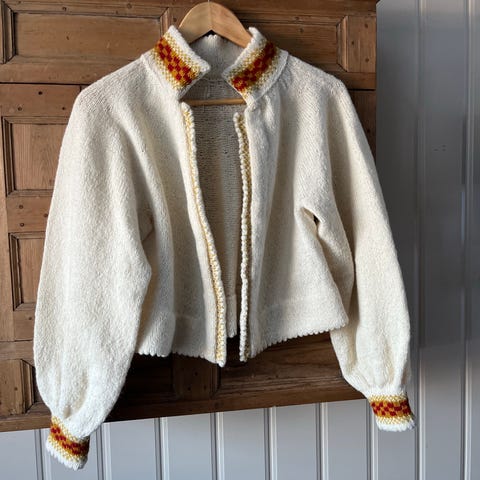 Bestemor er akkurat ferdig med en strikket kofte til rød Romeriksbunad. Den ble akkurat litt for liten til mottaker, så vi håper noen andre kan få glede av denne. Super konfirmasjonsgave!