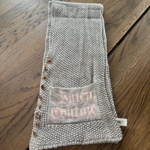 Juicy Couture scarf featuring a pattern of pink, grey and red lips on an off-white background, ends of the scarf are embellished with tiny clear crystal rhinestones. It is approx. 72 x 26 inches. Very versatile, can be worn on neck, head, as a belt, tied to handbag. Be creative! 100% polyester. Hand wash only ❤️