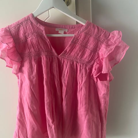 Holly Whyte by Lindex singlet in size L for women. The singlet is rosa in color and made from a lightweight fabric. It features a button-up front and ruffled sleeves, suitable for casual wear. #rosa #topp #bluse #lindex#holly #whyte # L