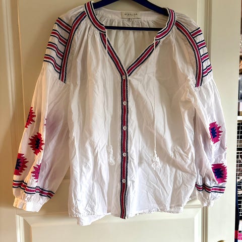 Ny bluse i hvit bomull med blått og rødt mønster. ( 88 prosent bomull, 12 prosent viskose.) volumiøse ermer med søm og rynker,
