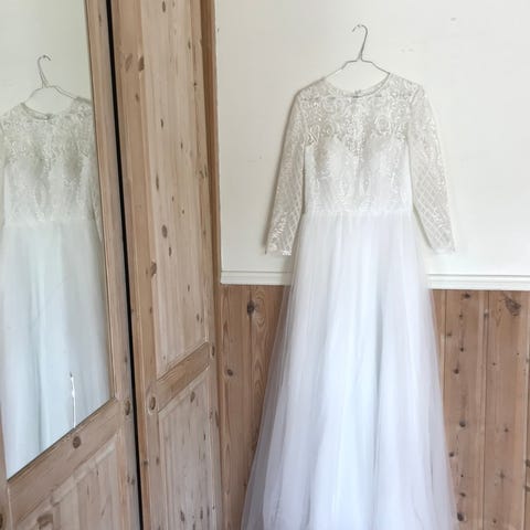 Helt ny og ubrukt nydelig brudekjole. Jeg brukte samme kjole i mitt eget bryllup, men en størrelse større. Vakre detaljer og god kvalitet. Innebygd BH. Veldig behagelig å ha på seg.