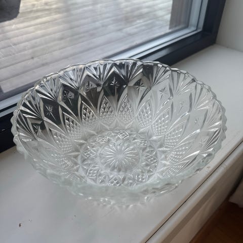 Selger en eldre serveringsskål med fruktmotiv.