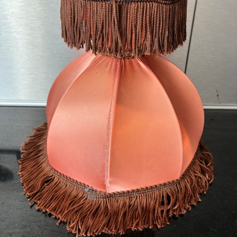 Lampeskjermer med frynser selges for 150 kroner (høyde 12 cm / diameter 11 cm). Fraktkostnader: PostNord - 69 kroner. Betaling via vipps.