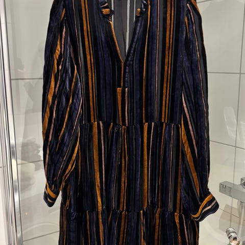 Ny kort tunikakjole str. L selges. Tunikakjole i crêpet, vevd bomullskvalitet med innslag av glittertråder. Volangkrage med smale knytebånd, V-formet åpning foran og trekvartlange, raglanskårne ballongermer med snøring nederst. Trukket elastikk i midjen og rett skåret kant nederst. Ufôret.