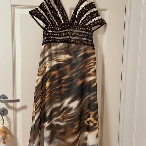 Sort festantrekk, kjole med gulltråder, stor, romslig, tungthengende