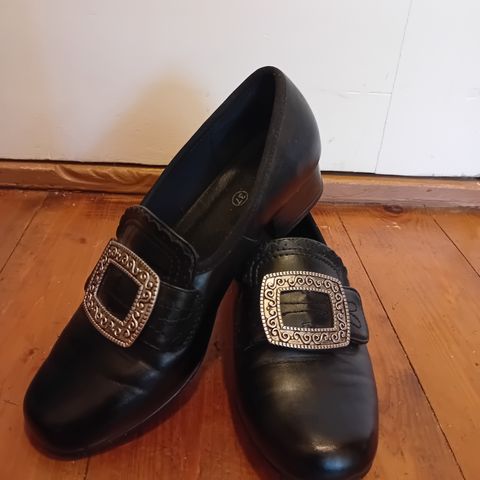 Håndsydde bunadsko av høy kvalitet. Overdel i sort kalveskinn av høy kvalitet.