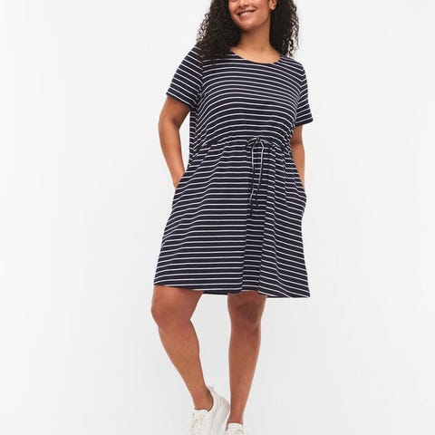 Rundhalset, kortarmet kjole med justerbar midje som gir litt mer fasong. Korte ermer.