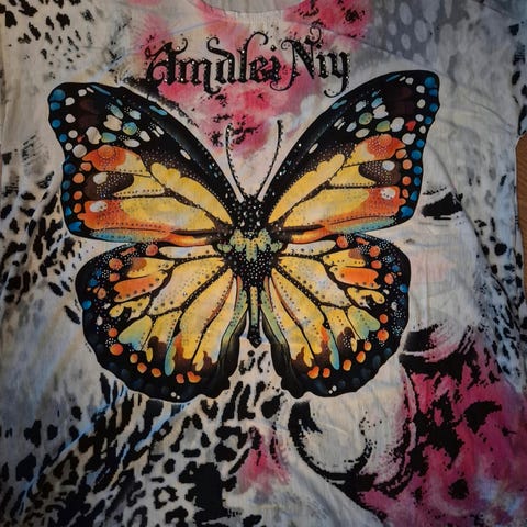 Pen og ubrukt topp i grå med rødt motiv foran fra Va Vite i str L.