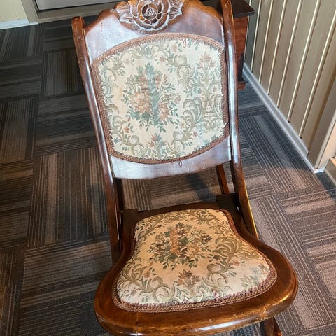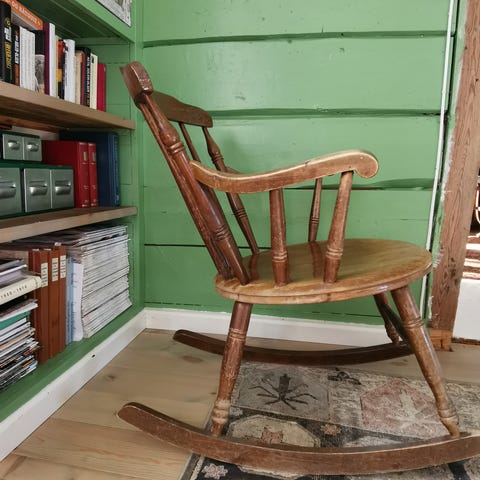 Eldre empire gyngestol fra England i heltre med stoff i rygg (foran/bak) og i setet. Solid og ikke vinglete når man gynger. God stopping (se bilde fra undersiden), men noe nedsittet i puten. Ellers i god stand. Må hentes.