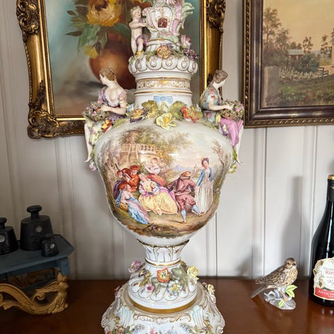 Vintage porselen lampe med nydelige detaljer ( engler ) ! Den funker som skal med nye ledninger! Selges samlet ! Du får velge skjermen