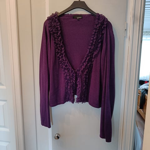 Pen jakke til dame i lys sand. 3 hekter i front lukking. 4 utvendige kummer foran med pynteknapp. Gullfarget kant bord. Silkefôr.