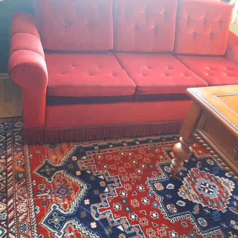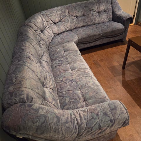 Sofa nummer 2 har ingen synlige hull, men er litt gulnet på seteputer, kan kanskje renses bort.