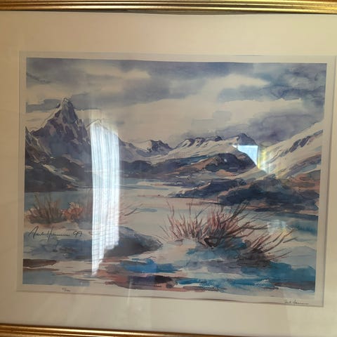 Innrammet akvarellmaleri. Ramme med glass.
