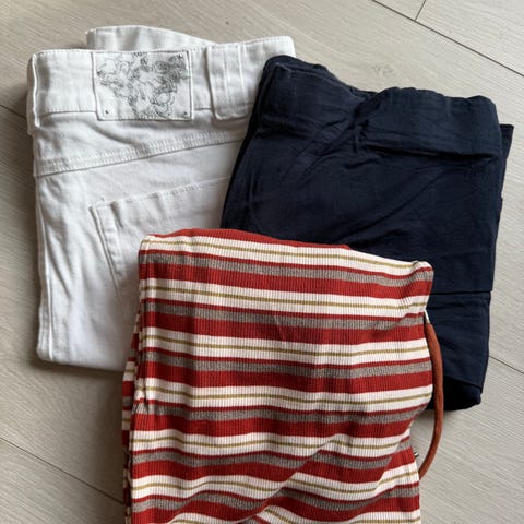 3 søte miniskjørt selges. Det ene er i et sort silkeaktig skjørt, og dette har et svakt mønster i seg. Det andre er i sort og hvitt, og er fra HM. Det tredje er også fra HM, og er i tykt jersey-stoff - grått med sorte hjerter. Alle tre har utrolig søt passform.