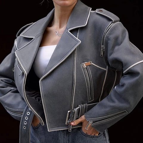 Jakken har litt cropped lengde, har full lengde på ermene, glidelås nederst på ermene, lommer i sidene + innvendig lomme. Fòr av viskose og polyester.